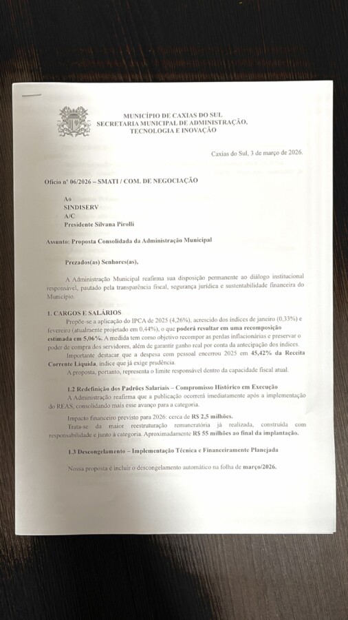 Conforme a Prefeitura de Caxias do Sul, na área de cargos e salários, o Executivo propõe a aplicação do IPCA de 2025 (4,26%), acrescido dos índices de janeiro (0,33%) e fevereiro (projeção de 0,44%), o que pode resultar em uma recomposição estimada de 5,06%. Segundo a Administração, a medida busca repor perdas inflacionárias e preservar o poder de compra dos servidores, com possibilidade de ganho real pela antecipação dos índices. A despesa com pessoal encerrou 2025 em 45,42% da Receita Corrente Líquida, percentual que, conforme o governo, exige prudência fiscal.