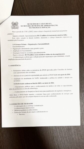 A proposta também prevê a redefinição dos padrões salariais, com impacto estimado de R$ 2,5 milhões em 2026 e aproximadamente R$ 55 milhões ao final da implantação. O Executivo afirma tratar-se da maior reestruturação remuneratória já realizada pelo Município. Já o descongelamento automático está previsto para a folha de março de 2026.