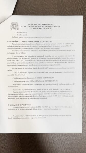 Na área previdenciária, a Prefeitura destacou ações voltadas à sustentabilidade do IPAM/FAPS. O patrimônio líquido do fundo, que totalizou R$ 442,2 milhões entre 2001 e 2022, alcançou R$ 794,4 milhões em 31 de dezembro de 2025. A evolução entre 2023 e 2025 foi de R$ 352,2 milhões, sendo que apenas em 2025 o acréscimo foi de R$ 140,4 milhões. A Administração afirma que os resultados demonstram fortalecimento financeiro do regime e garantem maior segurança aos cerca de 12 mil segurados.